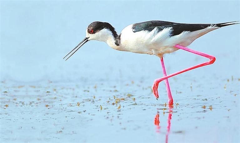 黑翅長腳鷸靜立淺灘時,恍若隨手放置的抽象雕塑——血紅色長腿占體長的三分之二,又仿若踩著高蹺的芭蕾舞者,每一步都能踏碎水面的金色霞光。一窩繁殖失敗的親鳥開始了第二次嘗試,它們將巢穴鋪設(shè)在湖畔,簡陋的碟狀巢,宛如浮于沼澤中的小舟。巢中往往是四枚橄欖色的梨形卵,點(diǎn)綴著不規(guī)則的黑褐色斑紋。雌雄輪流孵化,盡顯溫情。它行走時步履如詩般閑逸,卻在奔跑中暴露出笨拙的一面,如優(yōu)雅與窘迫并存。當(dāng)觀鳥者的影子掠過濕地,它便以頭顱叩擊空氣作警鐘,繼而振翅離去。