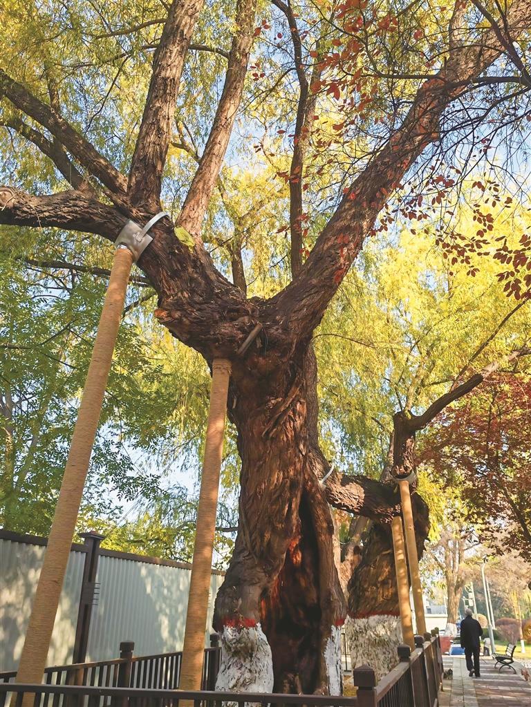 行至平沙落雁,路旁綠草之上,一株百年文冠果樹上果實(shí)累累,宛如哨兵般靜靜守候,為熱鬧的街市增添了幾分寧靜。在綠色公園內(nèi),一株700年樹齡的古國槐枝繁葉茂。復(fù)古的支架穩(wěn)穩(wěn)支撐著枝干,既確保它在歲月中安然生長,又透出滄桑之感?;◢弾r圍欄環(huán)繞四周,其上雕刻的荷葉荷花圖案栩栩如生,“愛護(hù)樹木”“保護(hù)生態(tài)”等文字清晰可見,無聲地倡導(dǎo)著人們保護(hù)環(huán)境、愛護(hù)植物。退休教師王淑芬正帶著小孫女玩耍,她笑著說:“這兒空氣好,景色美,每天帶孩子來親近古樹,也是在給她種下愛護(hù)自然的種子。”游客的歡笑聲、孩童的嬉戲聲與清脆的鳥鳴聲交織在一起,為古樹增添了別樣的活力。