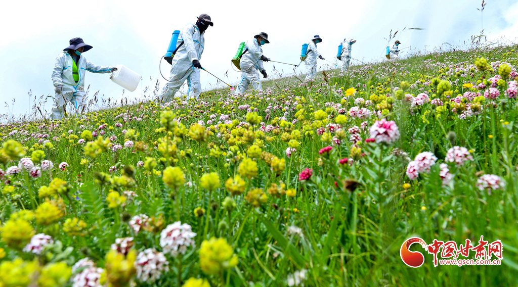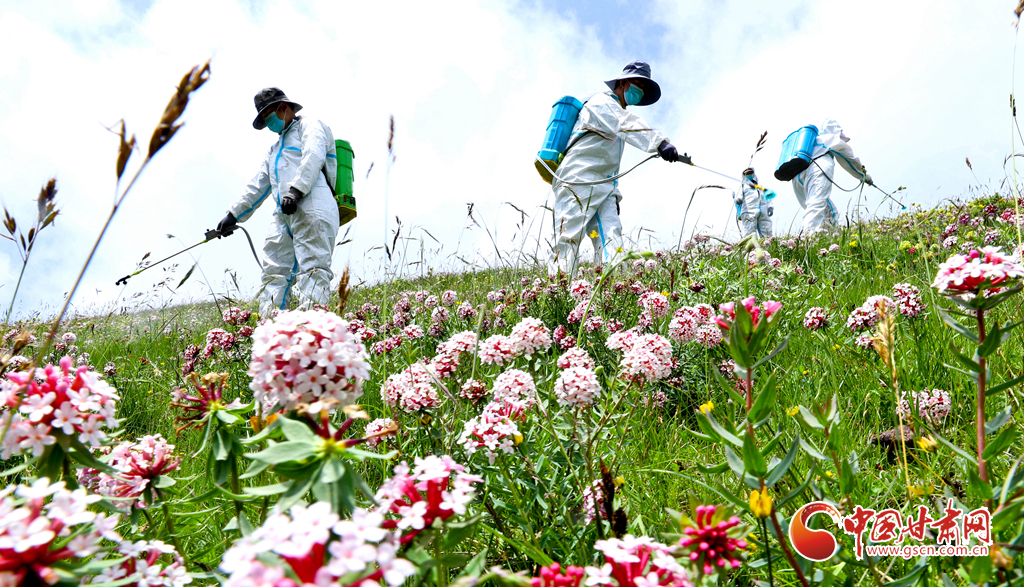 盛夏時節(jié),位于張掖市肅南裕固族自治縣的皇城夏日塔拉草原、康樂賽汗塔拉草原,宛如一塊巨大的綠色絨毯鋪向天際,滿目翠綠,令人心醉神迷。然而,此時也正是草原上狼毒花毒害草盛放、蝗蟲繁殖的高峰期。連日來,肅南縣林草專業(yè)技術(shù)人員帶領(lǐng)2000多牧民,抓住毒害草開花、蝗蟲繁殖最快,也是清除滅殺的最佳時機,在“三北”工程六期160多萬畝廣袤的草原上,打響了以“蟲害防治+害草治理+噴施葉面+播撒草籽的”為核心的“三北”工程林草濕荒一體化保護修復攻堅戰(zhàn)。